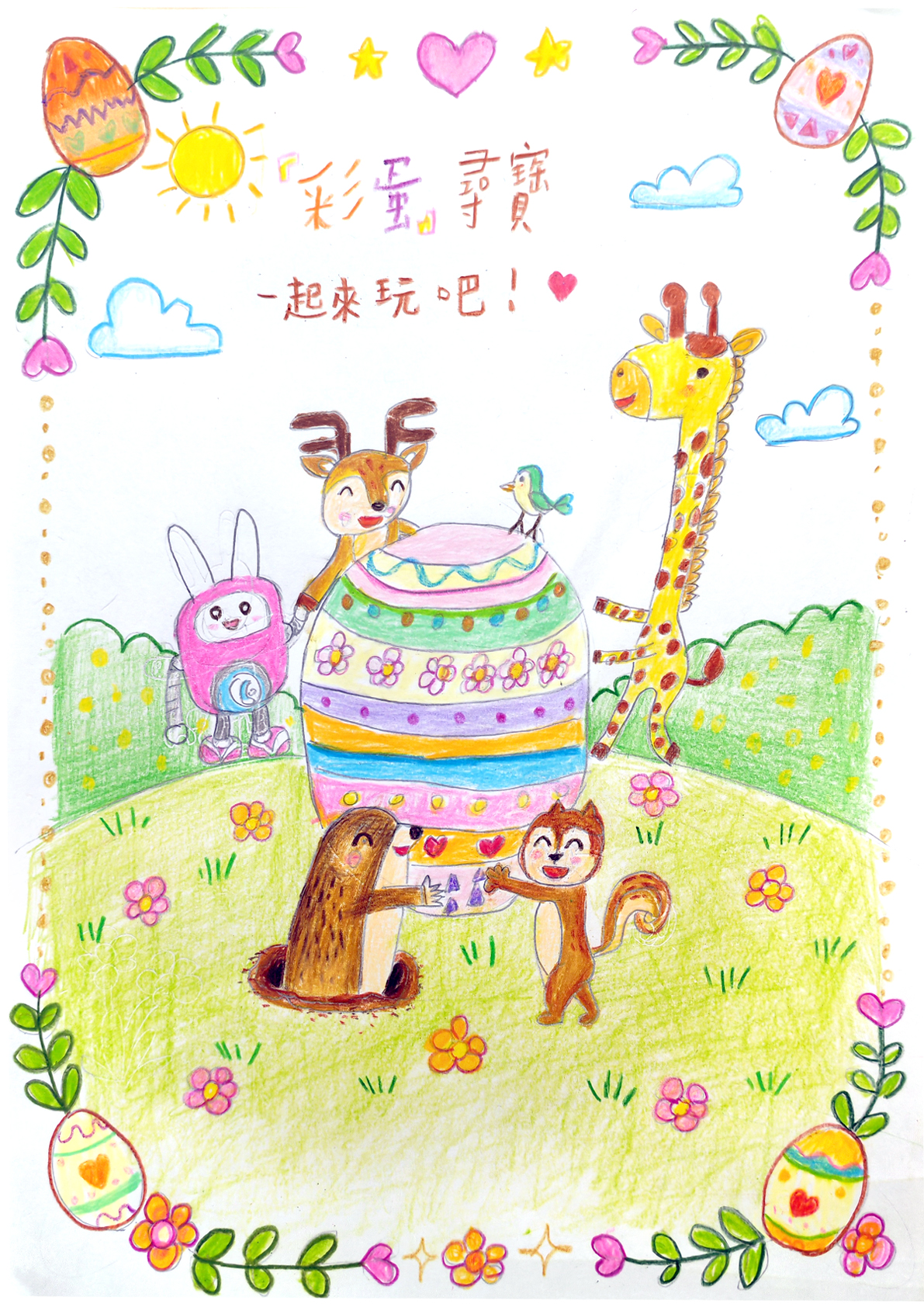 復活節快到了,兔爾斯想起自己以前也很怕生,於是決定用創意幫助害羞的小松鼠。他想出了「彩蛋尋寶遊戲」,既好玩又能讓大家互相合作。兔爾斯親手做了邀請卡,用彩色樹葉和野花裝飾,寫著:「親愛的朋友,分享歡樂的復活節快到了,我們發揮互助精神,合力挑戰彩蛋尋寶好嗎?」然後輕輕把卡片放在小松鼠家門口。